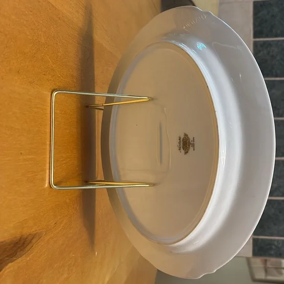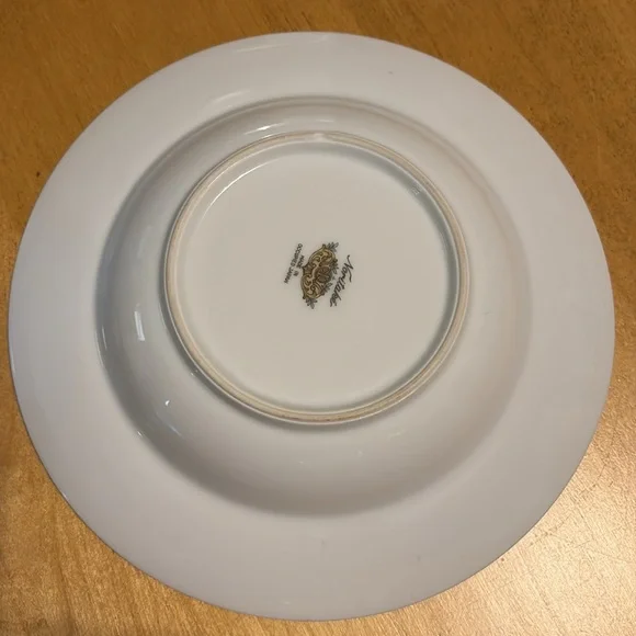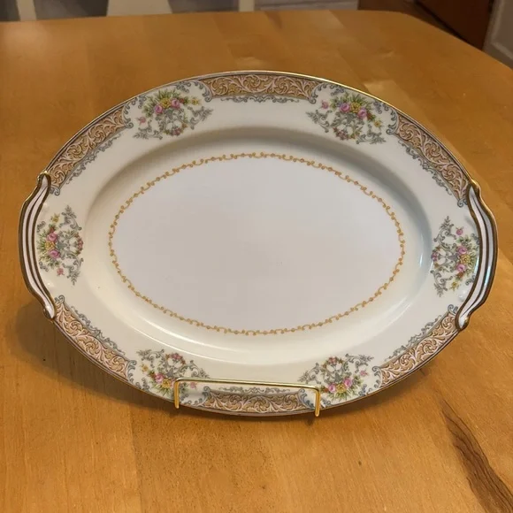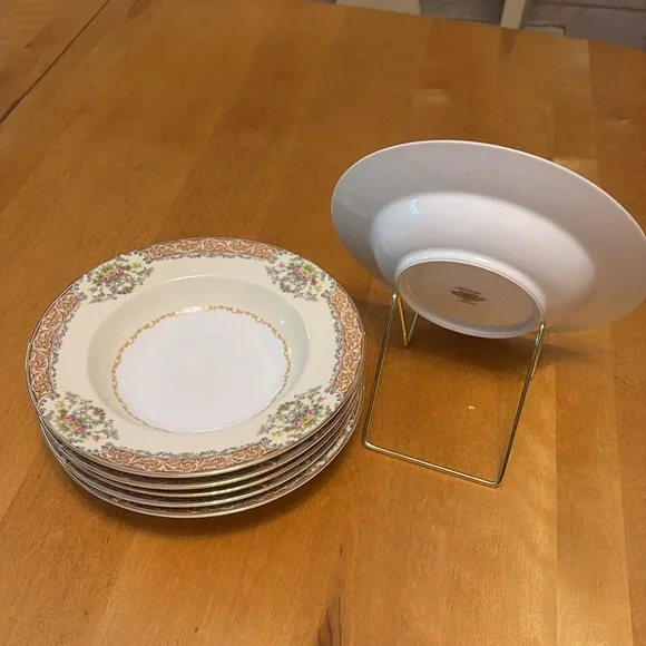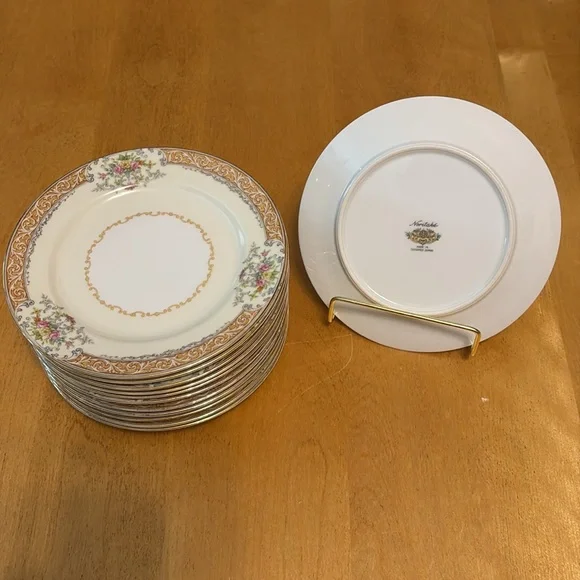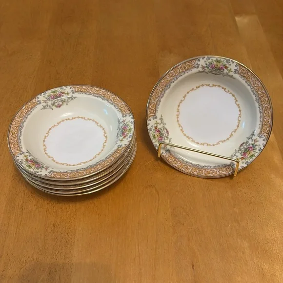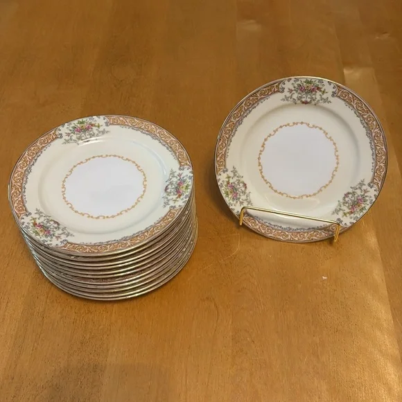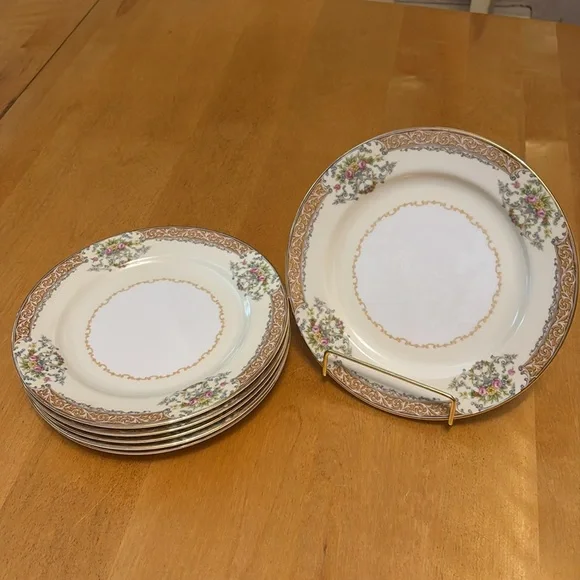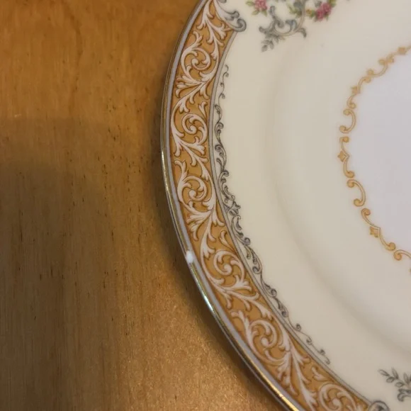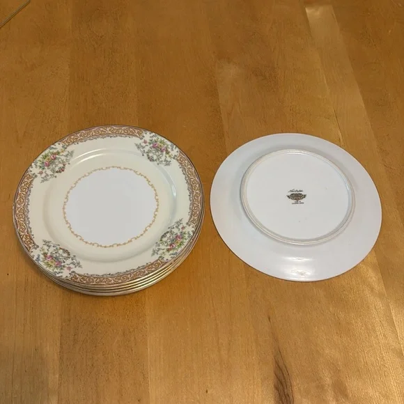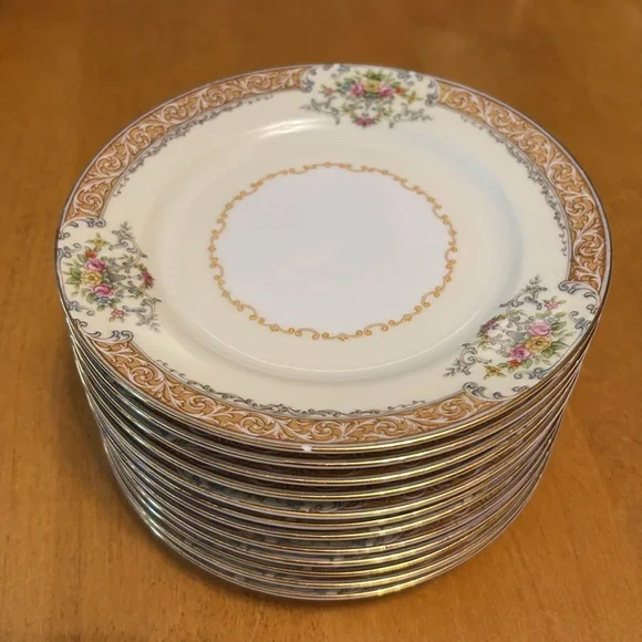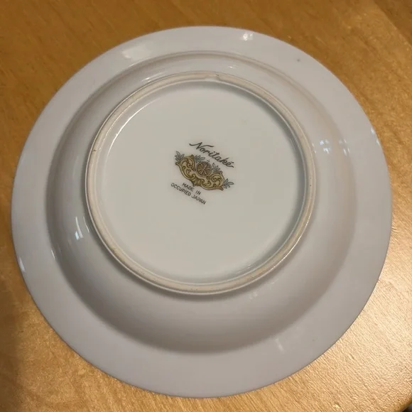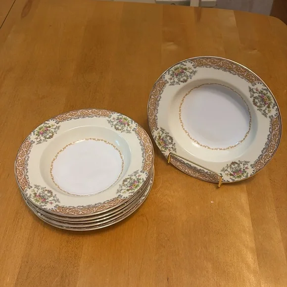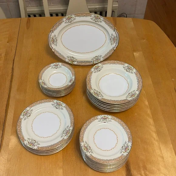 Noritake Mystery #56 31-Piece Porcelain Dish Set. Tan border with floral urns. Vintage from circa 1940-1947. Crafted in Occupied Japan. Discontinued. Hand wash. Used in very nice condition with no cracks or scraps. Set includes: (1) - 11 3/4" serving dish, (6) - 8 1/4" rim soup bowls, (6) - 7 5/8" salad dishes, (6) - 5 5/8" fruit/dessert sauce bowls, (12) - 6 3/8" bread & butter plates. Please note that one bread & butter plate has a small chip on the gold rim (see pictures), 1 fruit/dessert sauce bowl has a tiny imperfection on the bottom, and one rim soup bowl has a chip on the bottom. Please see pictures.